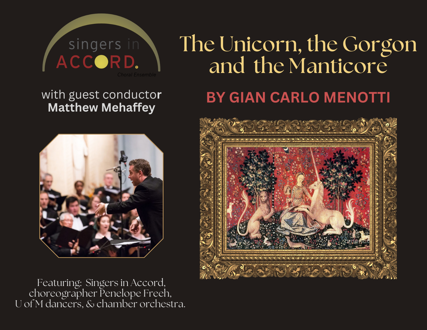 Experience a whimsical fusion of song and dance this spring as Singers in Accord joins forces with guest conductor Matthew Mehaffey for a breathtaking performance of Gian Carlo Menotti’s choral masterpiece, The Unicorn, the Gorgon and the Manticore. This enchanting "madrigal fable" comes to life through a vibrant collaboration with choreographer Penelope Freeh, the University of Minnesota dancers, and a live chamber orchestra. The story follows a reclusive Poet who lives in a castle and appears in town on three succesive Sundays, each time with a different mythical pet, symbolizing the three stages of the Poet’s life.